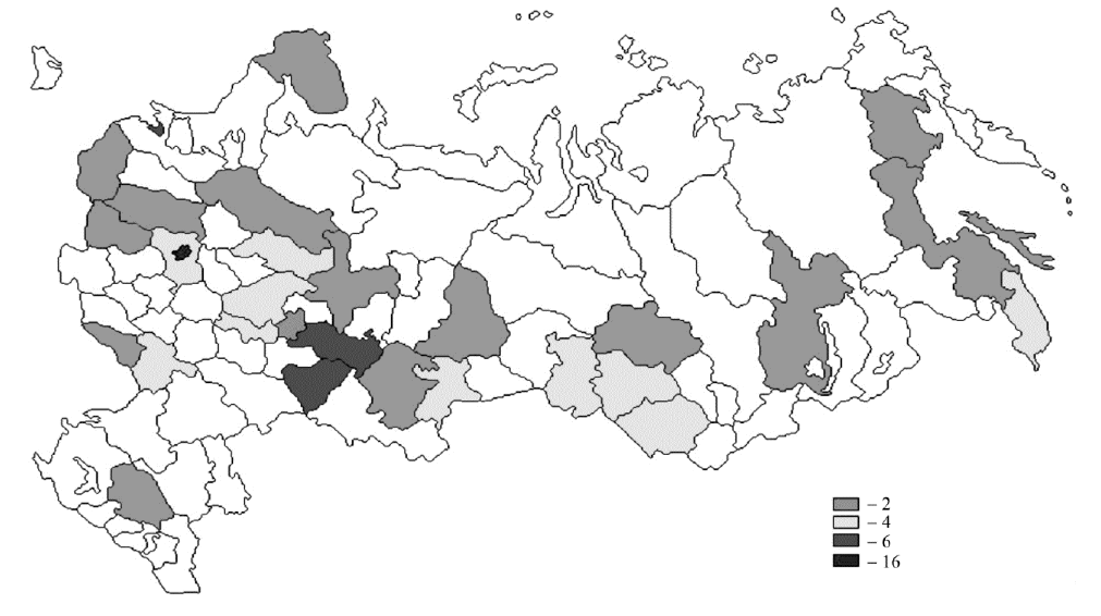 Явление низкой фармаконадзорной бдительности/приверженности населения, оцененное с помощью контент-анализа сообщений о побочных действиях лекарственных средств в сети Интернет за период 2009–2017 гг., заключалось в слабом территориальном распространении фармаконадзорной активности населения. Так, выявлено, что только 57,64 % (49 из 85 субъектов Федерации) регионов Российской Федерации демонстрируют активную позицию населения в сфере фармаконадзора (рисунок). При этом ранжирование регионов России по объему долей в общем массиве сообщений о побочных эффектах лекарственных средств от граждан демонстрирует преобладание низкоактивных регионов даже среди спонтанно репортирующего в Интернет населения субъектов Российской Федерации.