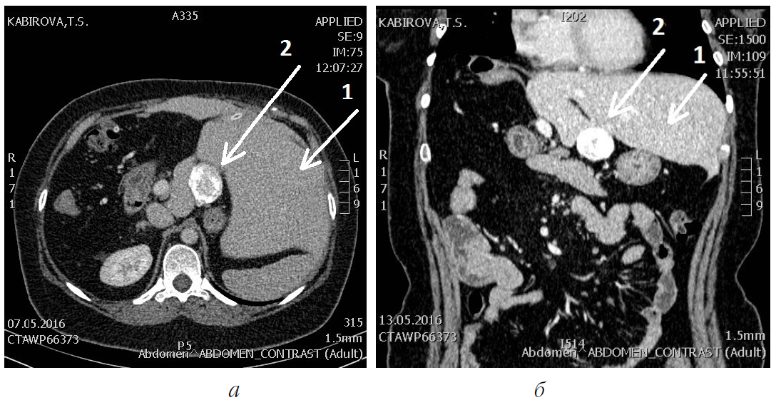 Рис. 1. Компьютерная томография брюшной полости пациентки К.: а – в аксиальной проекции; б – во фронтальной проекции; 1 – викарно увеличенная левая доля печени; 2 – петрифицированный остаточный узел альвеококка