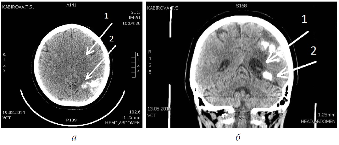 Рис. 2. Компьютерная томография головного мозга пациентки К.: а – в аксиальной проекции; б – во фронтальной проекции; 1 – левое полушарие головного мозга; 2 – множественные петрификаты в эхинококковых узлах
