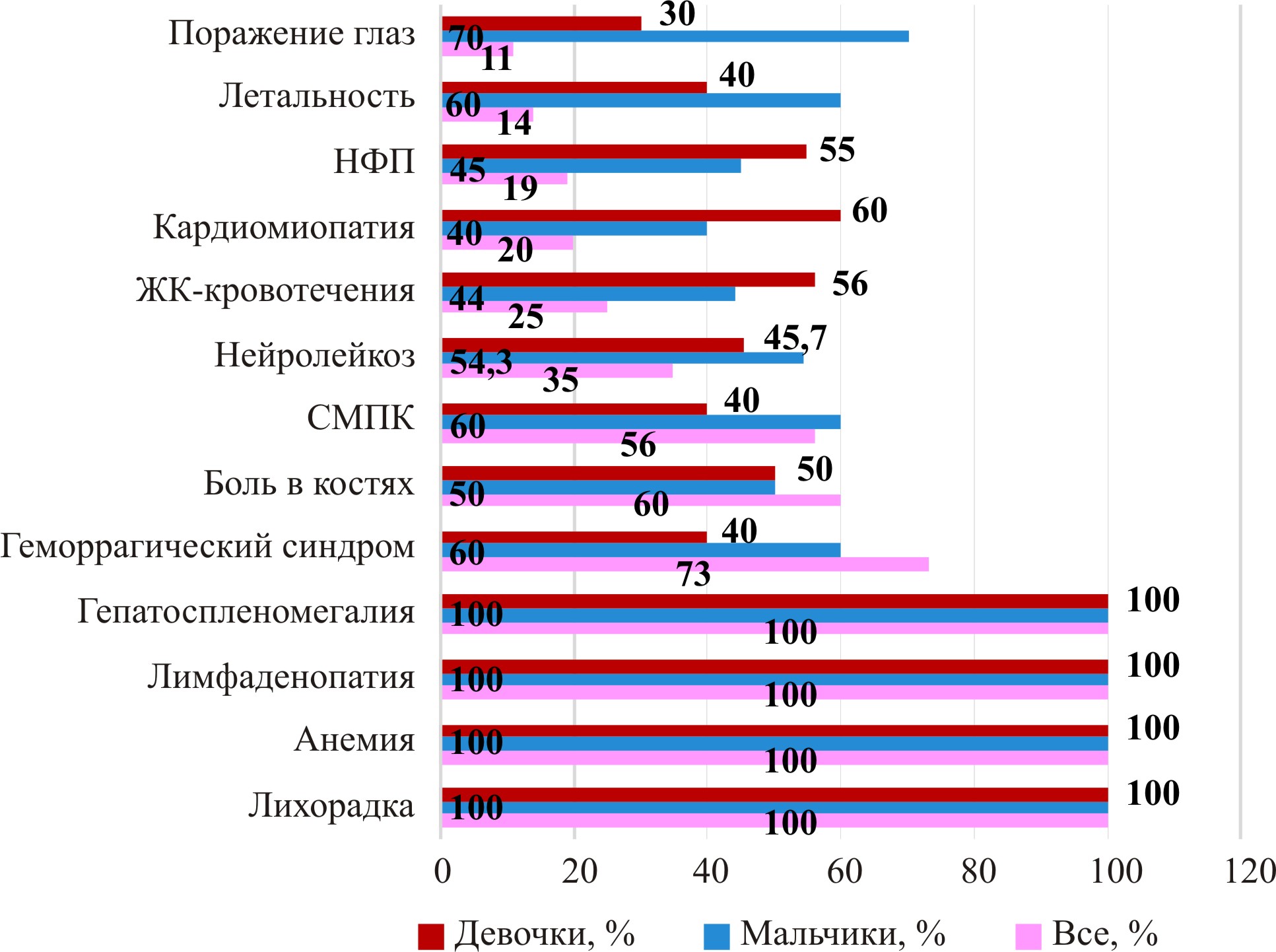 Пациенты имели классические клинические проявления ОГЗ (рис. 2). Лихорадка, анемия, лимфаденопатия, гепатоспленомегалия наблюдались у всех детей, геморрагический синдром – у 70 % пациентов, боль в костях – у 60 %, проявления – у 35 %, желудочно-кишечное кровотечение – у 25 %, нарушение функции почек (НФП) – у 19 %, переломы костей – у 18 %, поражение глаз – у 11 детей, летальный исход отмечен в 14 случаях.