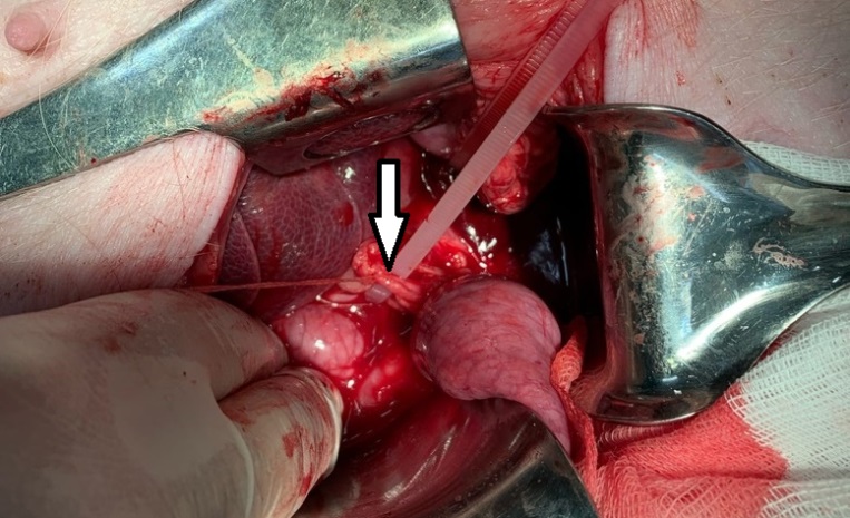 Рис. 1. Пластиковый хомут замкнут вокруг печёночно-двенадцатиперстной связки. Стрелкой обозначен лежащий вне созданной петли холедох