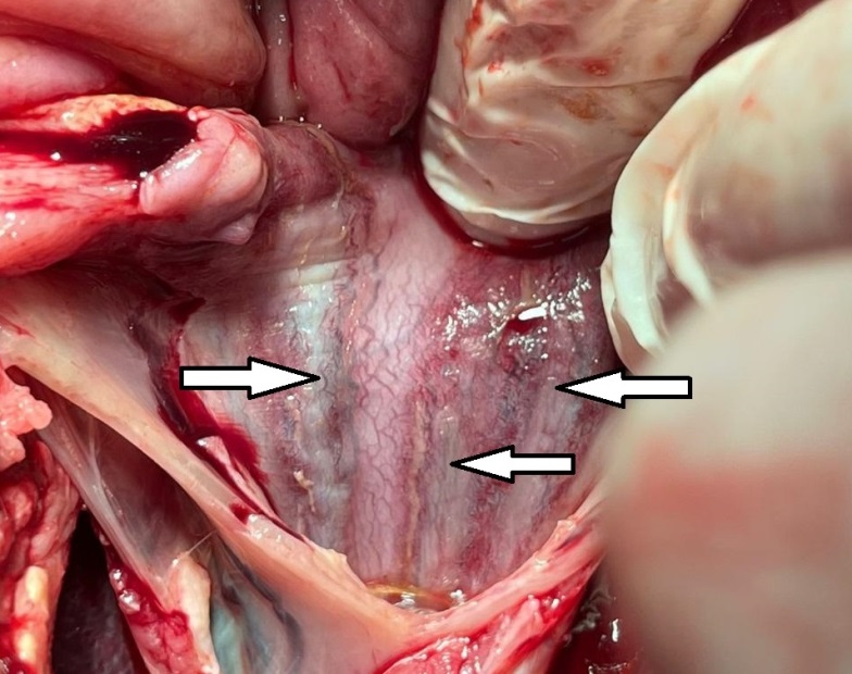 Рис. 2. Вызываемые проводимой операцией изменения в пищеводе свиньи. Стрелками обозначены расширенные венозные стволы