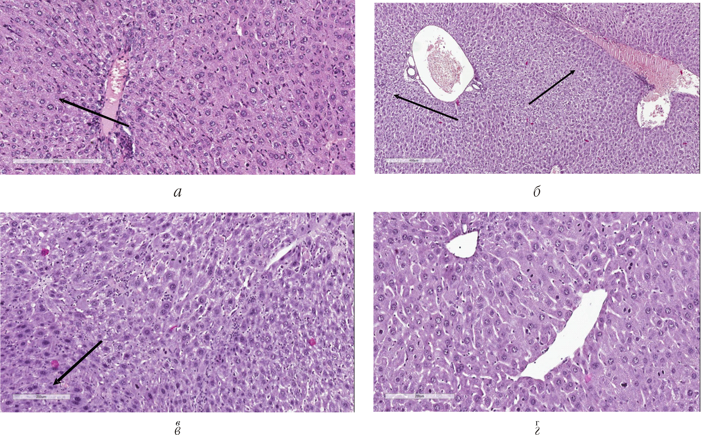 Морфологическое исследование печени на 7-е сут после ЧГ показало, что в синусоидах в большом количестве определялись мононуклеары и в небольшом количестве присутствовали сегментоядерные нейтрофилы. Гепатоциты были часто увеличены в размерах, с крупными гиперхромными ядрами, определялись фигуры митозов, двуядерные гепатоциты (рисунок, в). Вместе с тем при гистологическом исследовании ткани печени животных основной группы была отмечена большая сохранность архитектоники органа. На 3-и сут сохранялось балочно-радиарное строение, при этом просветы сосудов были расширены, без выраженного полнокровия. Дистрофические изменения обнаружены только в гепатоцитах центральных зон. В большом количестве определялись митозы (рисунок, г). К 7-м сут дистрофических изменений практически нет, морфологическое состояние печени близко к таковой в контрольной группе.