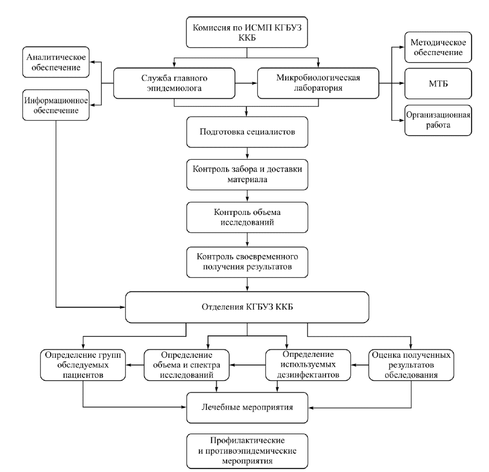 Общее руководство микробиологического мониторинга обеспечивает комиссия по ИСМП, в состав которой, наряду с ведущими специалистами, входят главный госпитальный эпидемиолог и заведующий микробиологической лабораторией. Госпитальный эпидемиолог
