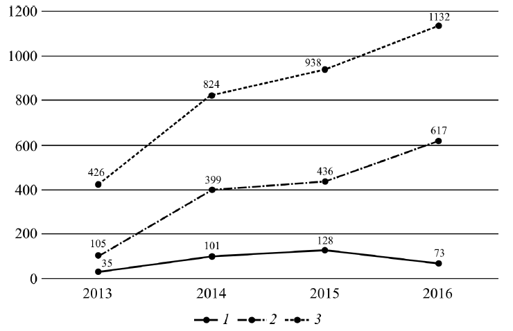 Рис. 2. Динамика клинических микробиологических исследований в многопрофильной медицинской организации в 2014–2016 гг.