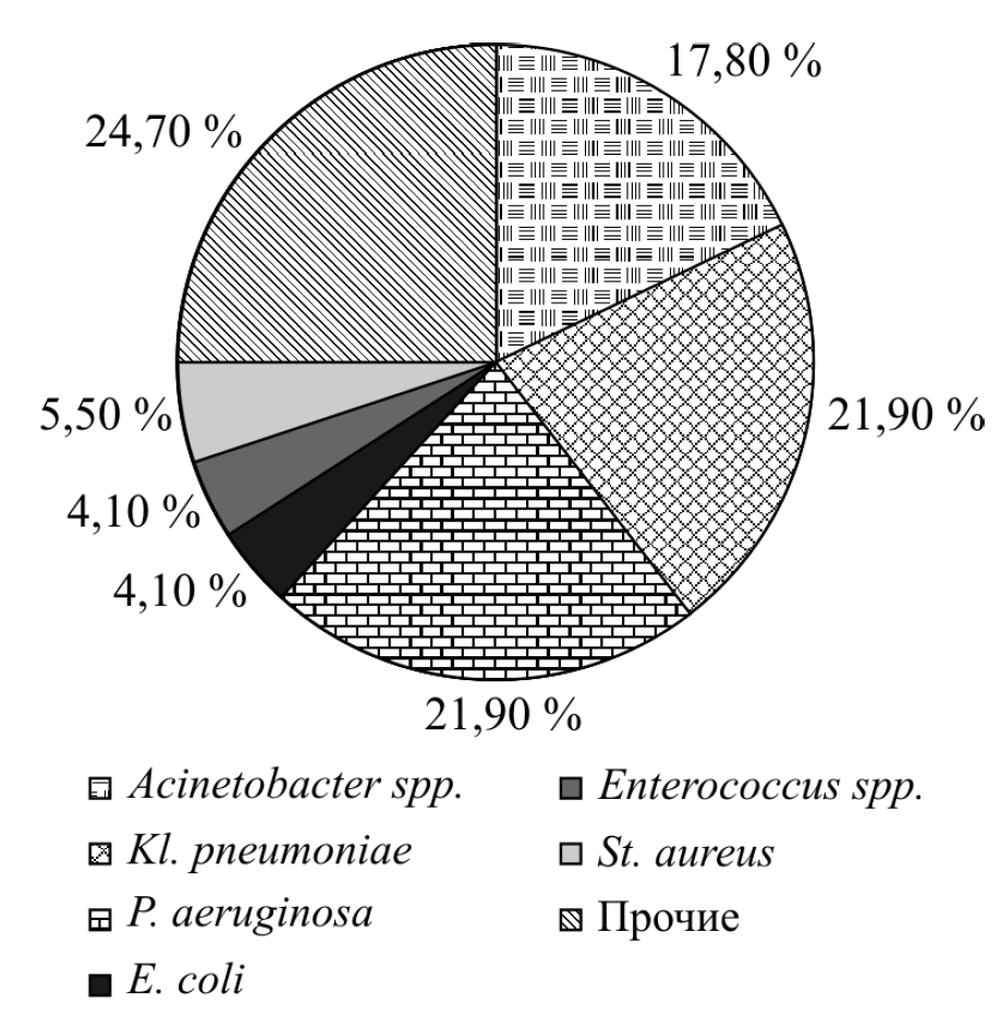 Как и в отделениях терапевтического профиля, в хирургических преобладали Kl. pneumoniae – 30,0 %, P. aeruginosa – 24,6 %, Acinetobacter spp. – 10,3 %.
