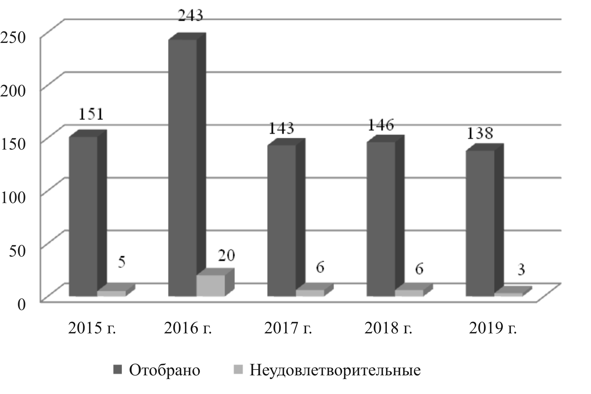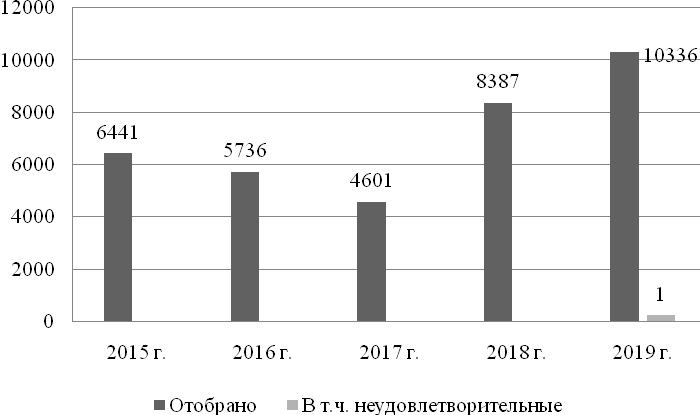 Рис. 7. Число проб рыб и рыбопродуктов, исследованных в 2015–2019 гг.
