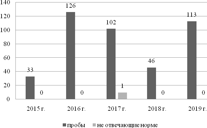 За период с 2015 по 2019 г. проводились исследования проб почвы – 12,5 % (5518 проб), воды – 6,9 % (3026 проб) и смывов с твердых бытовых поверхностей – 80,6 % (35 501 проба).