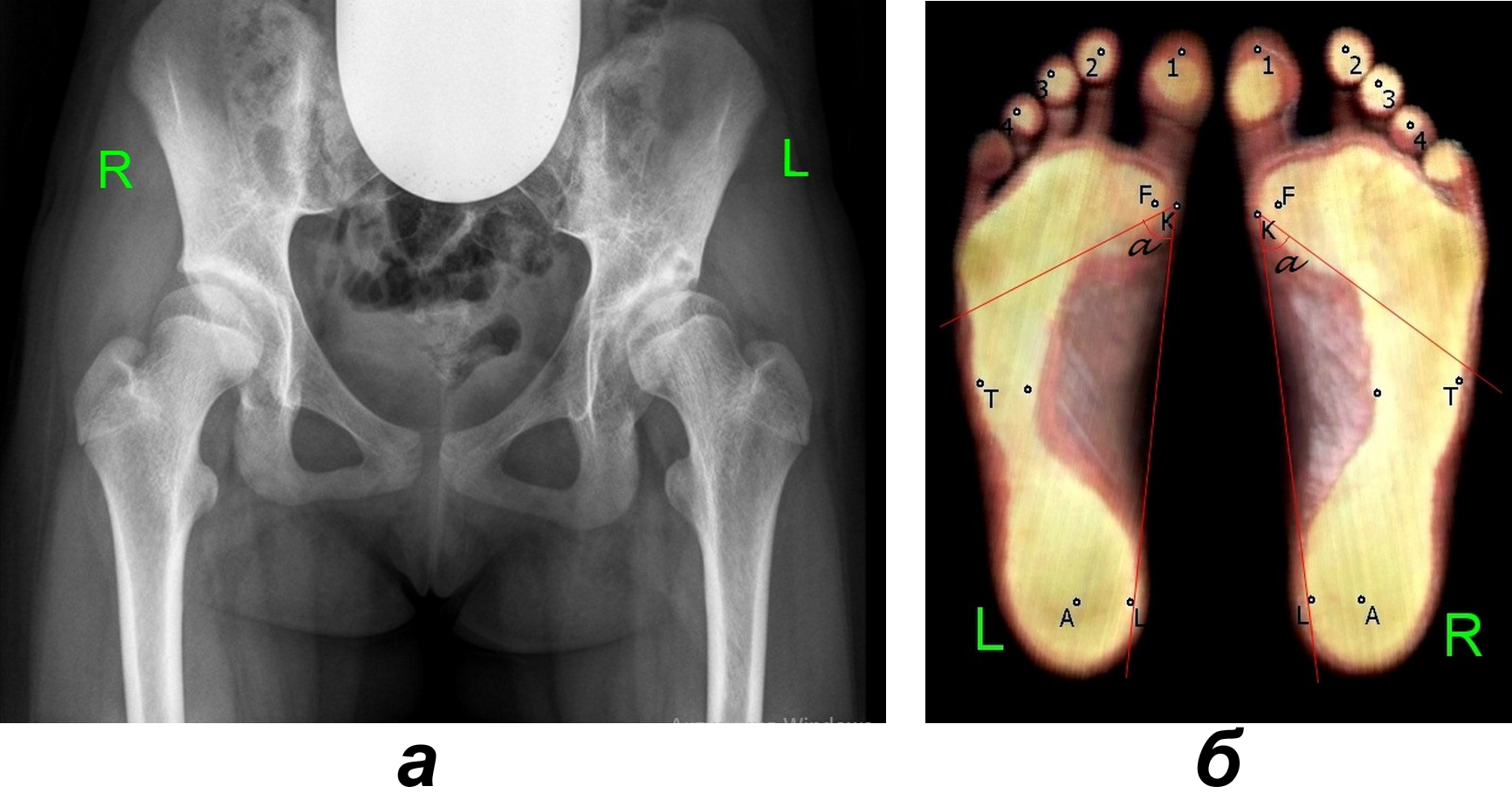 Рис. 1. Пациентка П., 16 лет, с дисплазией Crowe I группы: а – рентгенограмма тазобедренных суставов (выявляется подвывих бедра слева); б – плантограмма стоп интактной и поражённой сторон (выявляется увеличение угла Кларка α слева, снижение опорности головки 1-й плюсневой кости обеих стоп, больше слева)