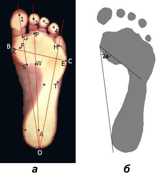 Рис. 2. Плантограммы стопы здорового ребенка: а – расчёт линейных параметров; б – расчёт углового параметра – угла Кларка α. Проведены идентификационные линии и расставлены реперные точки