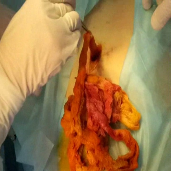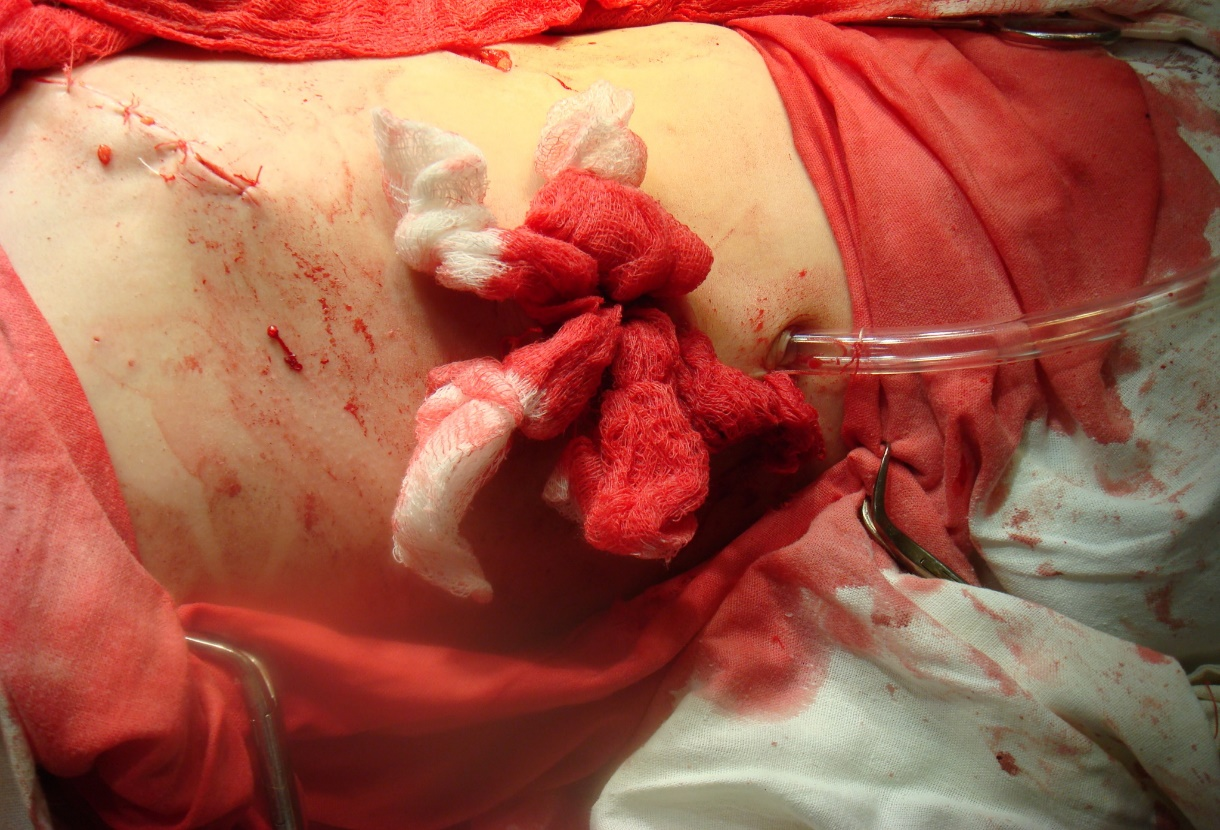 В 3 наблюдениях во время операции к ранам были подведены от 7 до 10 тампонов без выведения на переднюю брюшную стенку и с формированием лапаростомы. Тампоны извлекали на 2–3-и сутки. В одном из этих случаев попытка извлечения тампонов на 2-е сутки привела к возобновлению кровотечения и перетампонаде по разработанной нами методике (см. клинический случай).
