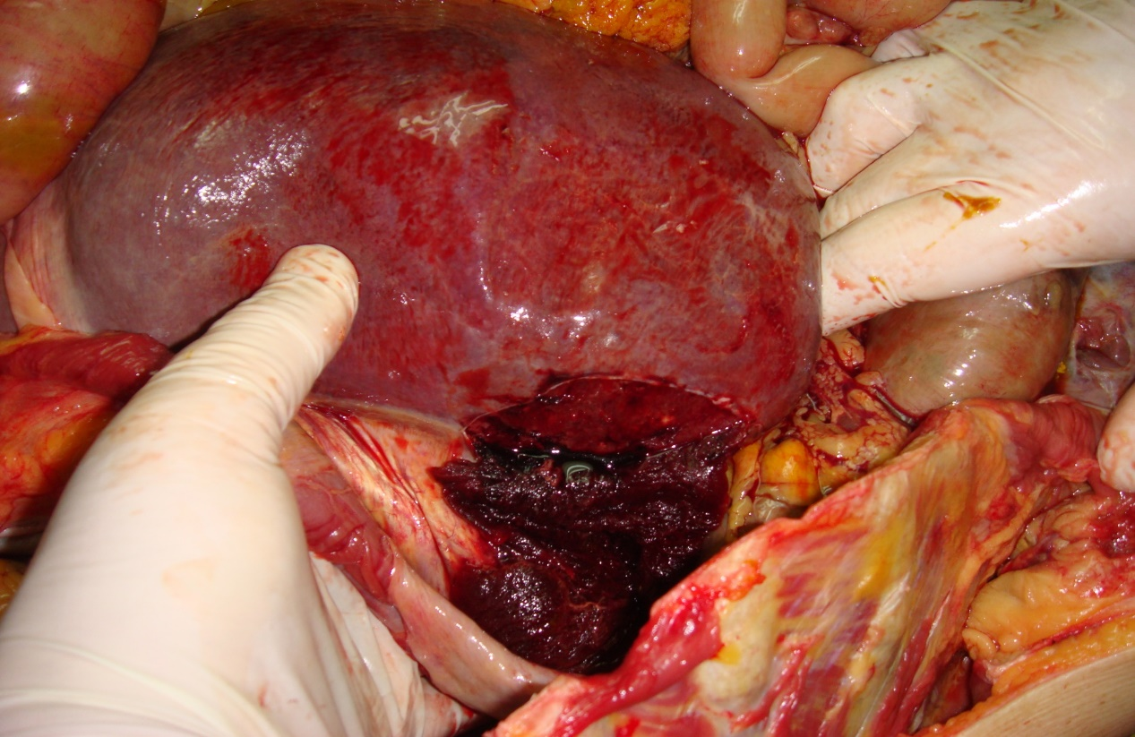 При лапароскопии – кровь. На операции в брюшной полости более 2 литров крови и сгустков. Имеется неполный отрыв левой доли печени по междолевой борозде с продолжающимся кровотечением. Разрыв продолжается на висцеральную поверхность правой доли. Разрыв глубокий, до 8 см с размозжением ткани в нем. Отрыв желчного пузыря от ложа. Диагноз: закрытая травма живота. Отрыв левой доли печени. Разрывы и размозжения печени IV степени. Внутрибрюшное кровотечение. Забрюшинная гематома. Геморрагический шок 3-й ст. Алкогольное опьянение.