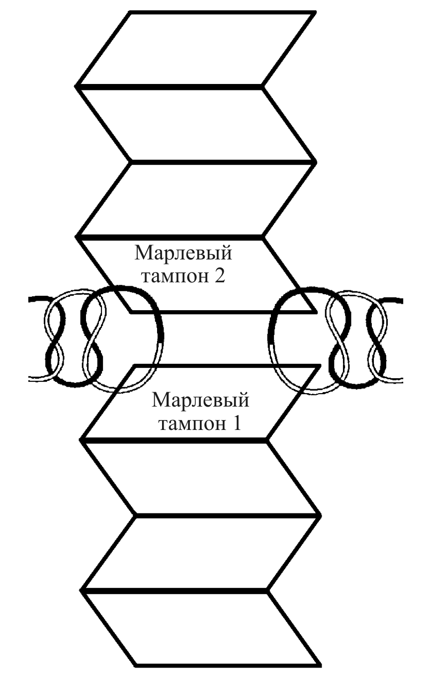 В итоге в процессе использования различных методик тампонирования нами был разработан наиболее эффективный, по нашему мнению, способ тампонирования (RU 2739539 C1). Сущностью методики является послойное помещение гемостатической губки (ТУ 9393-001-16794798-2013 РУ № РЗН 2015/2311 от 19.05.2017 г.) и марлевых тампонов на кровоточащую поверхность раны. Марлевые тампоны укладывают один за другим по принципу «черепицы», при этом сшивается конец одного с началом другого до обеспечения тугого тампонирования (рис. 3); конец последнего тампона выводят на переднюю брюшную стенку. В одном из наших наблюдений длина такой ленты из тампонов составила около 6 м (клинический случай).