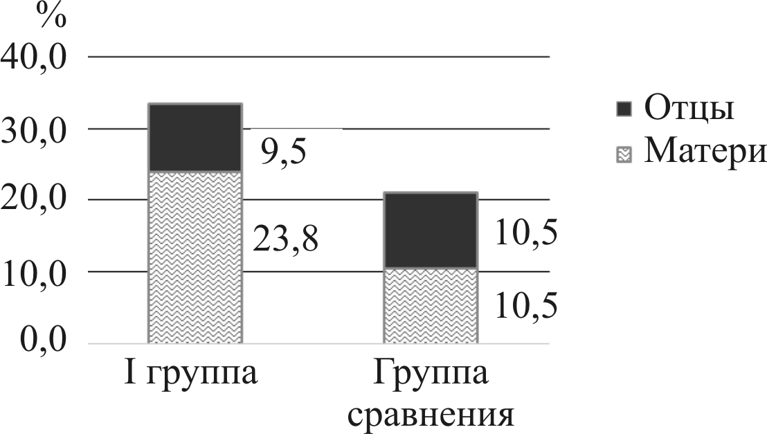 Все дети осмотрены в катамнезе в возрасте 5–6 лет. Выявлено, что дети обеих групп имели отягощенную наследственность по аллергическим заболеваниям (рис. 1).