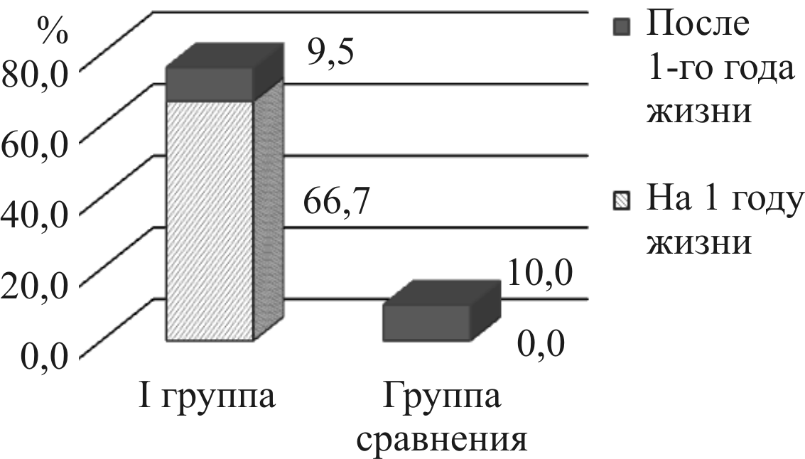 При изучении данных неонатального периода выявлено, что дети основной группы по клиническим показаниям из роддома были переведены в реанимационное отделение ДГКБ № 13 для дальнейшего наблюдения и лечения. Дети группы сравнения имели при рождении оценку по шкале Апгар 8–9 баллов, из роддома были выписаны на 4-е сут домой.