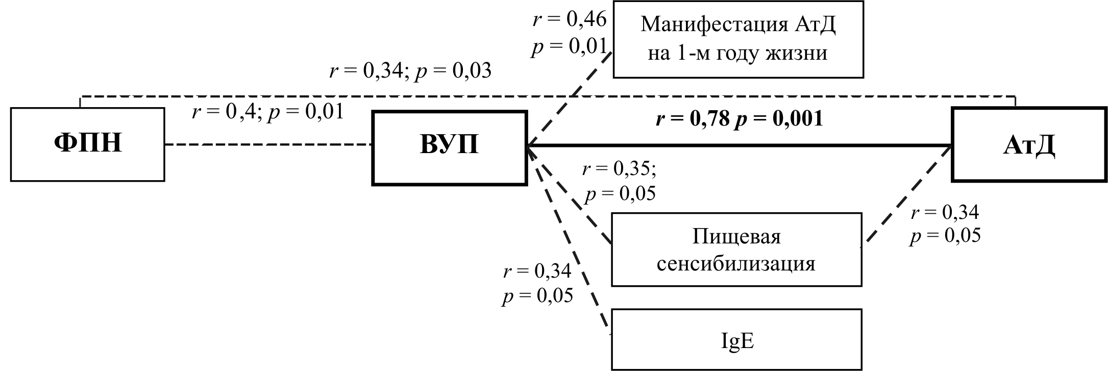 Выявлена корреляция средней силы: фетоплацентарная недостаточность (изменения плаценты, околоплодных вод, патология пуповины) и атопический дерматит r = 0,343 р = 0,03. Определена сильная связь между внутриутробной пневмонией и атопическим дерматитом r = 0,778 р = 0,001 (рис. 3).