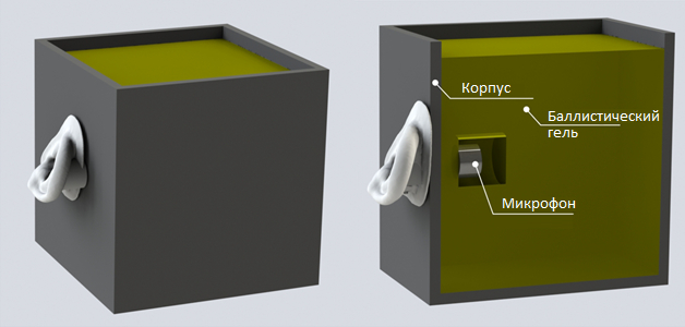 В качестве имитатора головы человека был использован полимерный резервуар кубической формы с внутренним объемом около 1500 см3, полученный методом FDM 3D-печати из пластика PLA, характеристики передачи звука в котором достаточно близки к таковым костной ткани человека [23, 24]. Толщина стенок резервуара – 6 мм. В одну из стенок резервуара был установлен реальный титановый отоимплантат, к разъемной части которого прикреплен испытываемый виброакустический излучатель. Измерительный микрофон установлен на расстоянии 2 см от места введения имплантата. Для эмуляции влияния на передачу звука тканей головного мозга весь внутренний объем резервуара был дополнительно заполнен баллистическим гелем на основе желатина с плотностью около 1,1 г/см3. Бионический протез уха был соединен с ноутбуком при помощи беспроводной сетевой технологии Bluetooth. Микрофон подключался к ноутбуку через проводное соединение. Использование шумовиброизолированной коробки позволило пренебречь влиянием внешних акустических и вибрационных сигналов.