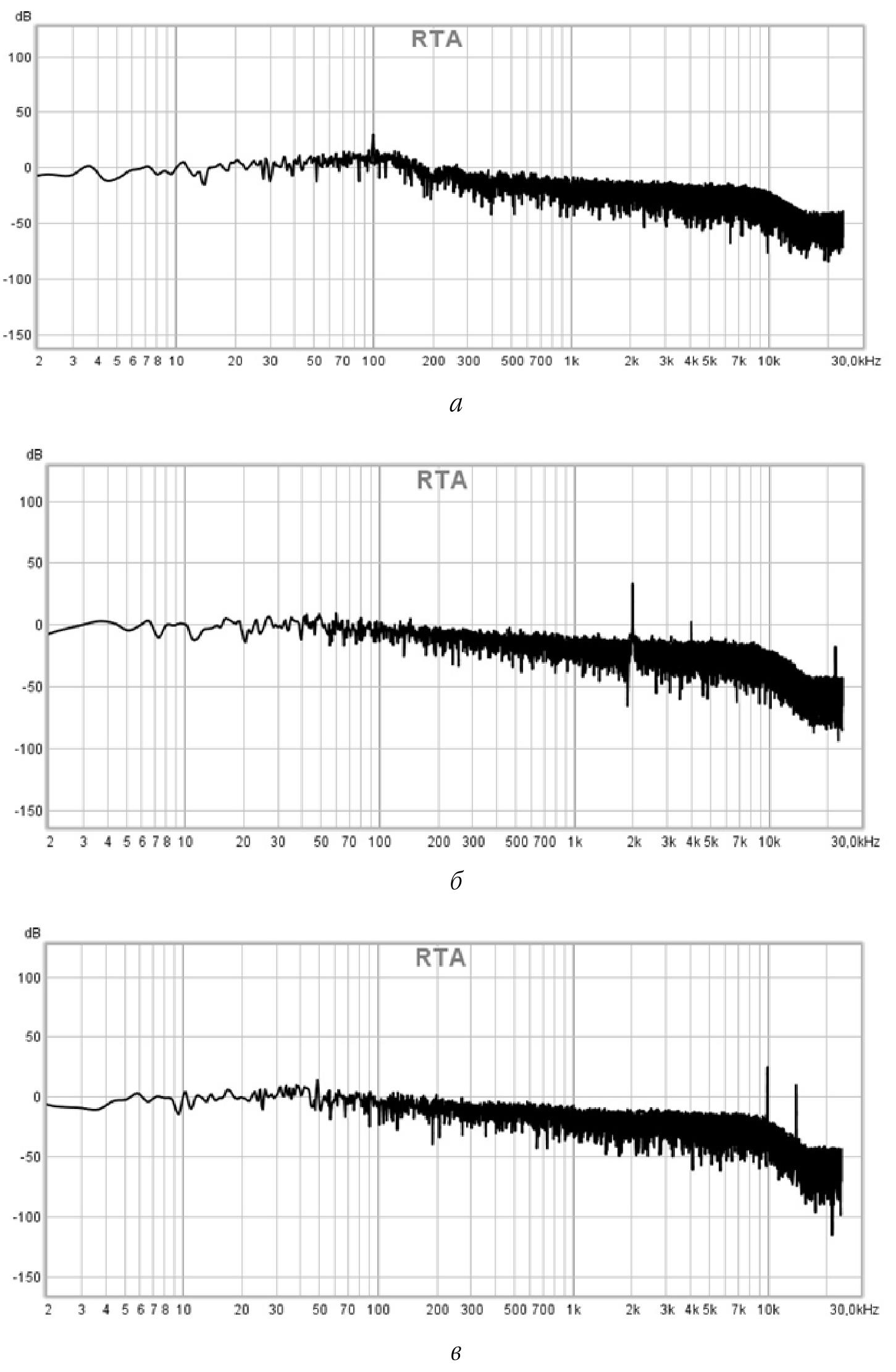 Рис. 2. Амплитудно-частотная характеристика синусоидального сигнала при: а – F = 500 Гц и мощности 100 %; б – F = 2 кГц и мощности 100 %; в – F = 10 кГц и мощности 100 %