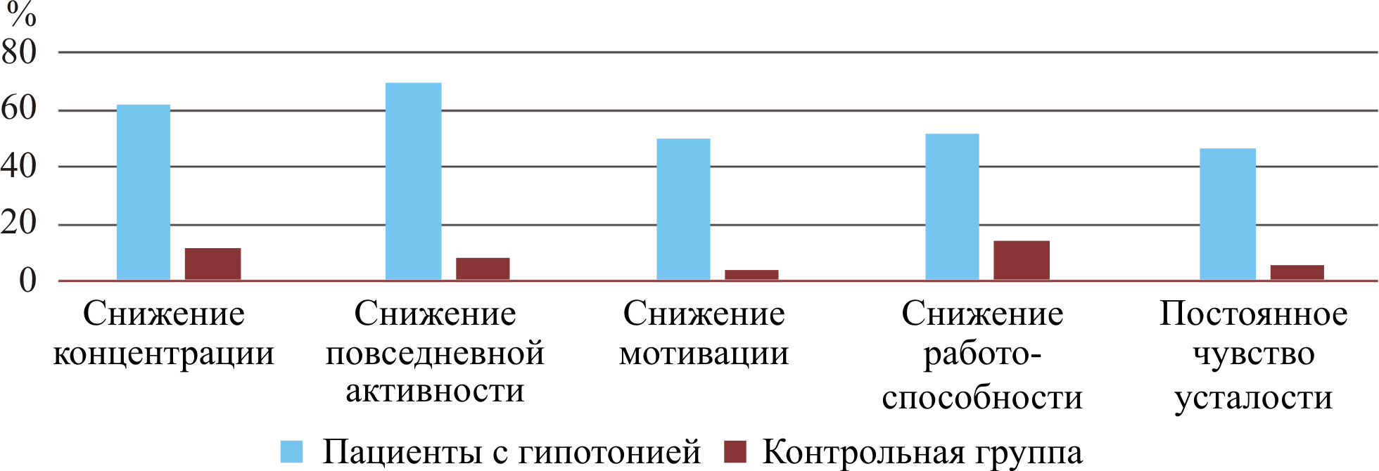 Materials and methods. A survey in patients aged 18–44 years with arterial hypotension was conducted in electronic format using the Google Forms service (Google Forms). The survey involved 100 persons with arterial hypotension, the control group consisted of 50 persons. Data processing was carried out using Microsoft Excel as well as statistical methods were used.