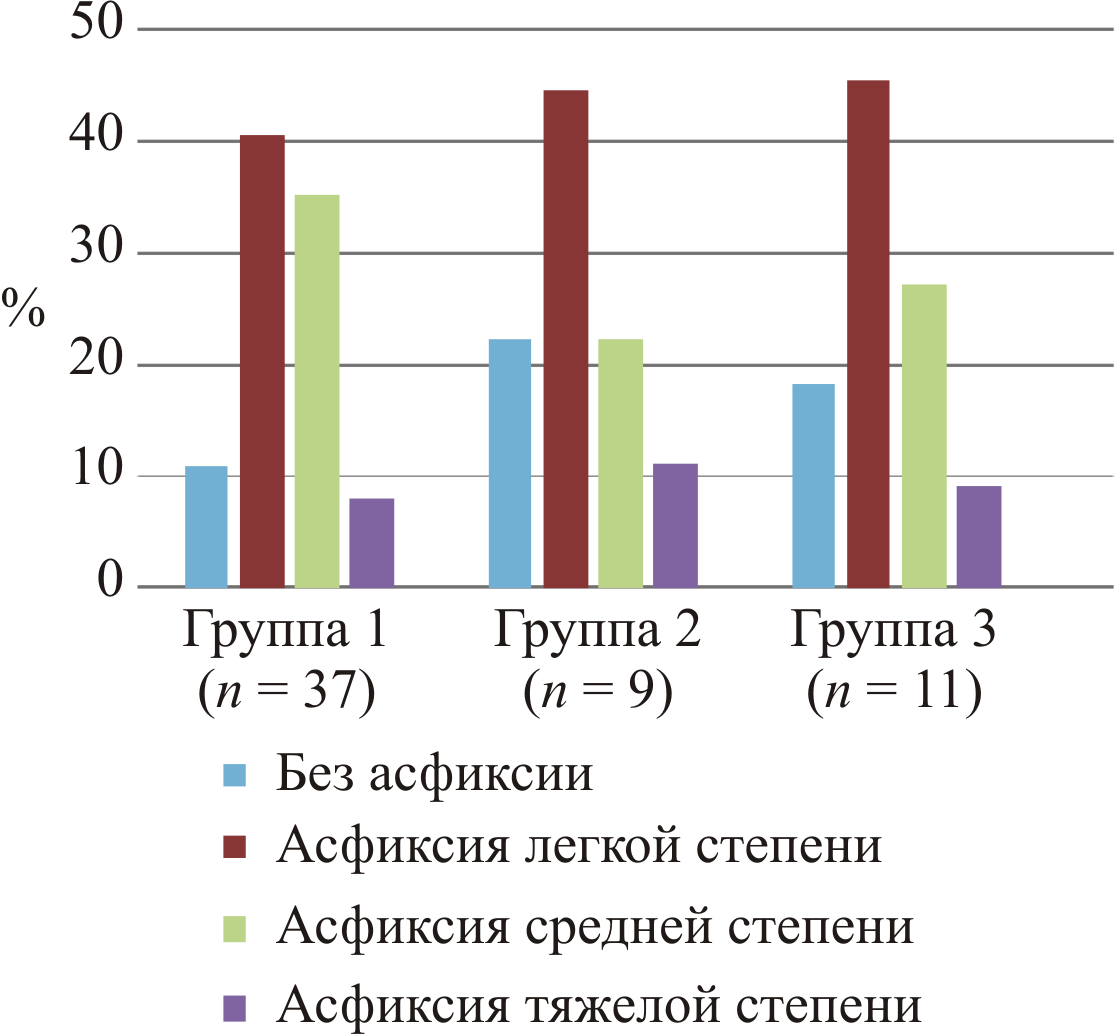 Новорожденные 1-й группы чаще имели асфиксию различной степени тяжести, при этом тяжелая асфиксия в данной группе выше (5, или 13,5 %), что является закономерным и связано с более тяжелыми проявлениями врожденной инфекции, высокой частотой осложненного течения беременности у данной группы и экстренными показаниями для оперативного родоразрешения в связи с острой внутриутробной гипоксией плода. Тяжелая и средней степени тяжести асфиксии чаще была обусловлена аспирацией мекониальных вод: по имеющимся данным, это отмечалось у 19 новорожденных (11 %), что способствовало проникновению бактериального агента в легкие и персистированию в них. Дети из 2-й группы преимущественно рождались в асфиксии легкой степени (4 новорожденных, или 44,5 %). В данной группе в сравнении с 1-й и 3-й группами чаще рождались новорожденные без асфиксии – 22,2 % (1-я группа – 10,8 %, 2-я группа – 18,2 %). На рисунке представлены данные о состоянии детей при рождении.