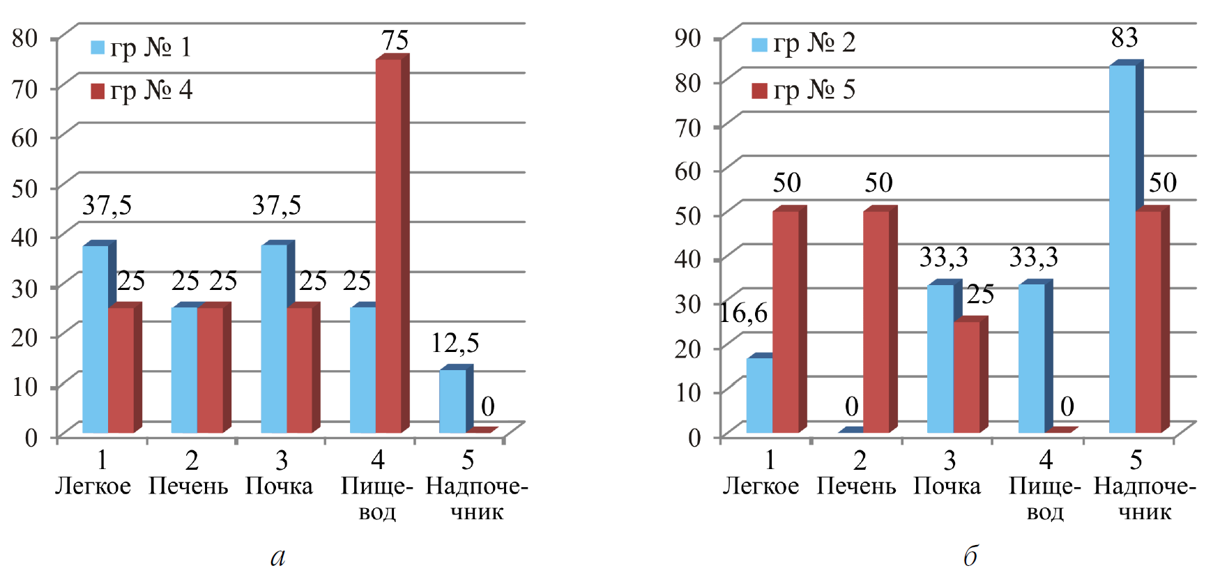 Рис. 1. Графики относительного количества (%) животных в каждой группе (группы № 1, 4, 2, 5), в органах которых наблюдались кровоизлияния: а – группы № 1 и 4; б – группы № 2 и 5