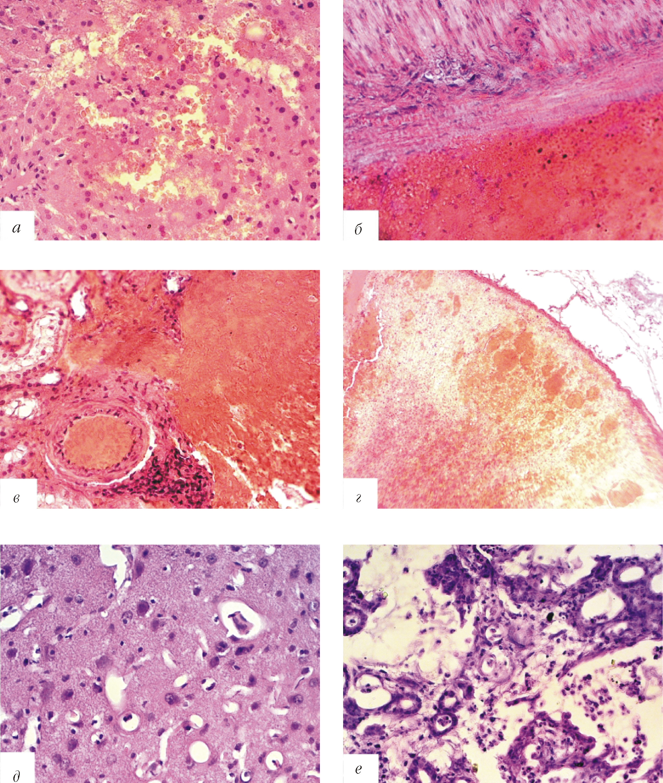 Рис. 2. Гистологическое строение органов: а - печень, очаги некрозов (группа № 1); б – желудок, кровоизлияние в серозную оболочку (группа № 1); в – почка, кровоизлияние в корковом веществе (группа № 4); г – надпочечник, кровоизлияния в корковом веществе (группа № 2); д – кора головного мозга, дистрофия нейроцитов (группа № 2); е – двенадцатиперстная кишка, воспалительная инфильтрация в подслизистой оболочке (группа № 2). Окраска гематоксилином и эозином. Ув. а, б, в, д, е – х400, г – х200