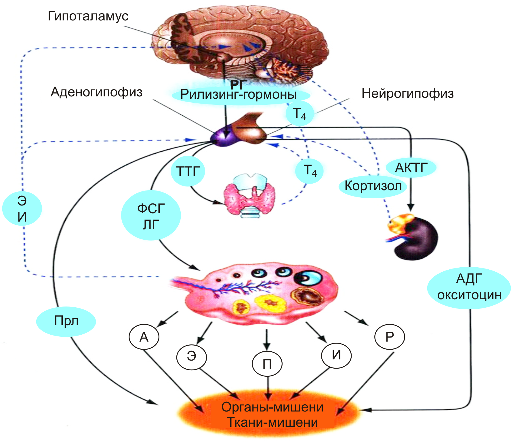 Функционирование репродуктивной системы обеспечивается генетически запрограммированным взаимодействием пяти основных звеньев, каждое из которых регулируется по принципу прямой и обратной, положительной и отрицательной взаимосвязи (рис. 1).