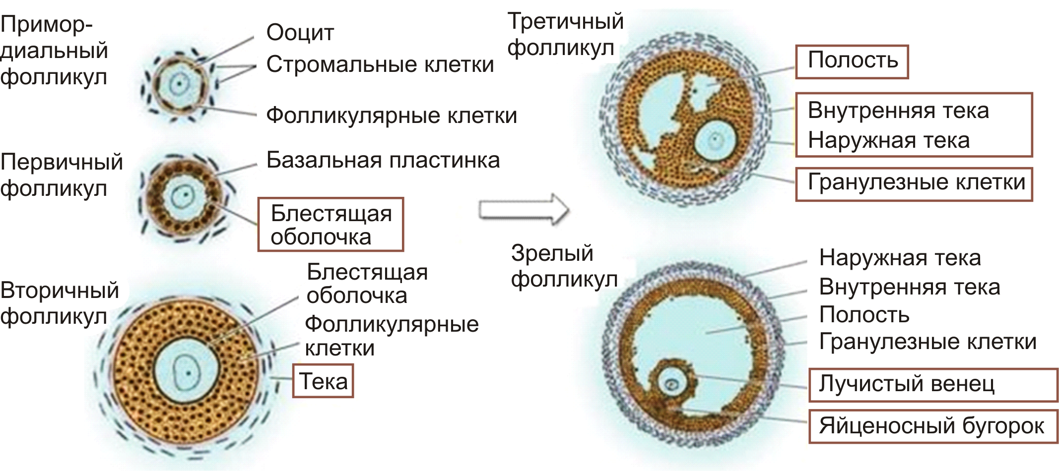 К четвертой ступени регуляции РС относят яичники. Внутри фолликула устанавливается межклеточная коммуникация, предполагающая обмен информацией между ооцитом и его «компаньонами» – гранулезными и тека-клетками посредством ауто- и паракринных взаимодействий. Пул примордиальных фолликулов лоцируется в толще коркового слоя яичника, в то время как антральные фолликулы чаще встречаются в менее жесткой мозговой области. Фолликулогенез – это последовательный процесс клеточной пролиферации и дифференцировки для формирования овуляторного фолликула с параллельно развивающейся физиологической атрезией других фолликулов. В большинстве исследований доказано, что преантральная стадия роста фолликулов гонадотропин-независима, ИФР-1 индуцирует экспрессию рецептора фолликулостимулирующего гормона в гранулезных клетках, повышая гонадотропинчувствительность, а обработка преантральных фолликулов гонадотропинами (ФСГ и ЛГ) способствует их росту до антральной стадии. В отличие от примордиальных, преантральные фолликулы на начальной стадии обладают рецепторами к ФСГ и по мере роста становятся все более гонадотропин-чувствительными [14]. Стадии роста фолликулов представлены на рис. 2.