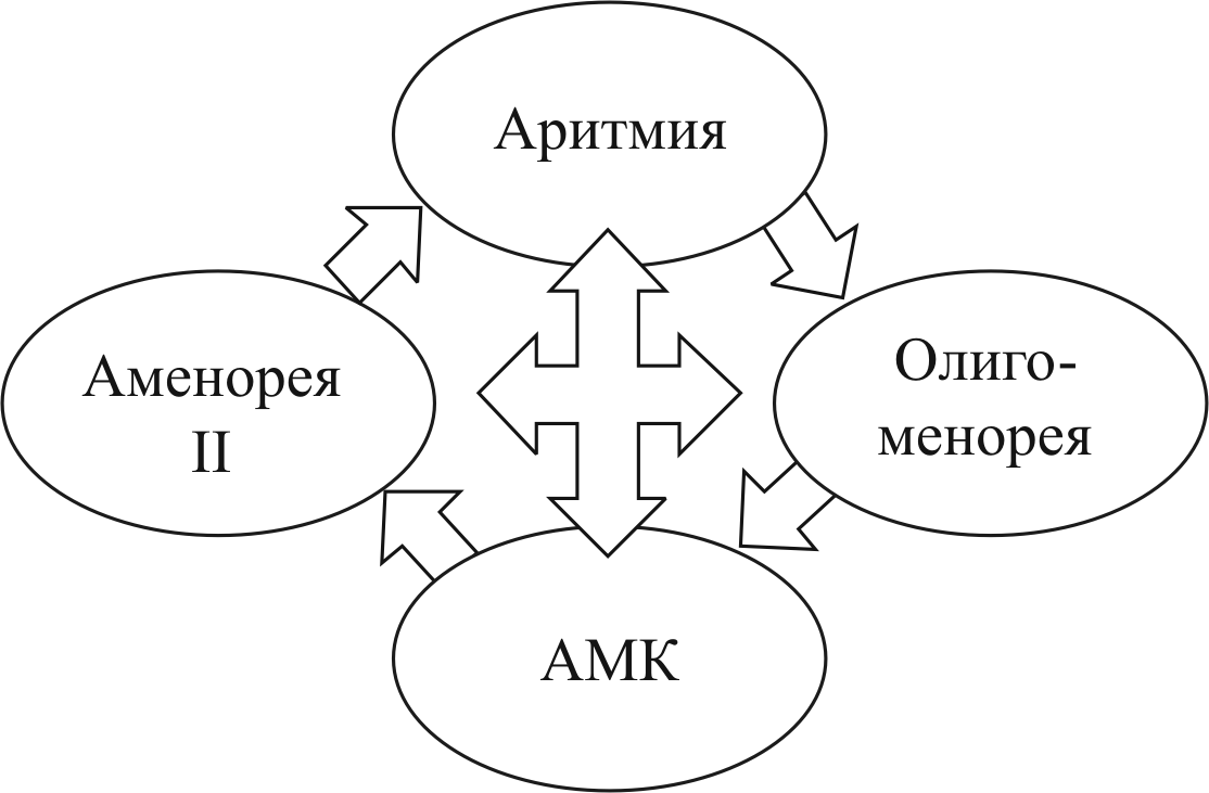 ННМФ могут проявлять себя аритмией, олигоменореей, аменореей, ациклическим аномальным маточным кровотечением и, как правило, сопровождаются нарушением овуляции. Важно подчеркнуть, что часто нарушения менструального ритма – аритмия, олигоменорея, аменорея рассматривают отдельно, в то время как они могут быть проявлением единого патологического процесса, могут переходить из одной формы в другую, наблюдаясь последовательно на разных этапах жизни у одной и той же женщины (рис. 4).