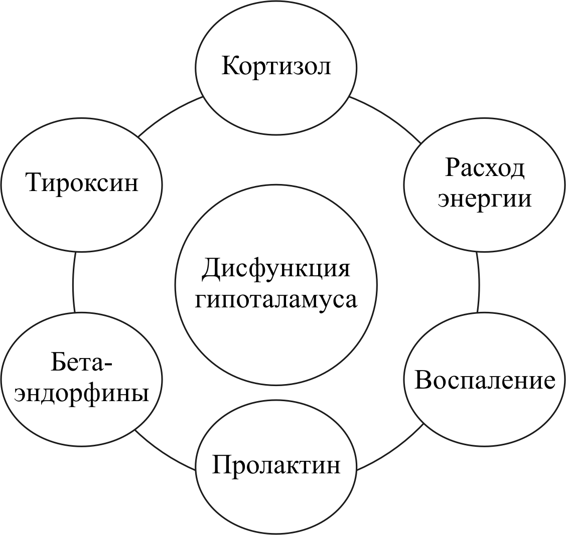 Нарушение нейромедиаторного баланса, вследствие которого возникает ННМФ, могут возникать в силу различных причин ‒ стресса, воспалительного процесса различной локализации, дефицита энергии, связанного с несбалансированным питанием, голоданием или ожирением, дисфункцией щитовидной железы. Ожирение, по меткому выражению А.С. Горелышева, это «голод среди изобилия»; поскольку сопровождается лептинорезистентностьюю, инсулинорезистентностью на уровне гипоталамуса, делая его рефрактерным к ощущению насыщения (рис. 5).