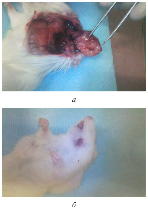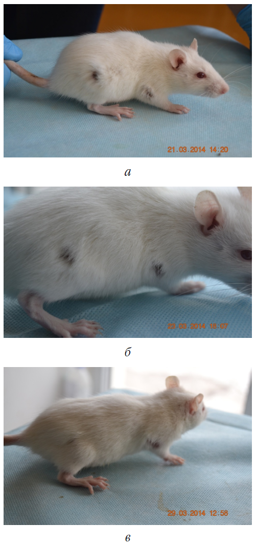 В опытной группе рост опухоли отмечен у 5 из 8 особей, с последующим отторжением опухолей у всех особей (рис. 3, 4). У особи, изображенной на рис. 4, через два месяца вновь отмечен рост опухоли до 1,7 см, только уже в правой подмышечной области, спустя три недели произошло отторжение опухоли (рис. 4, в).