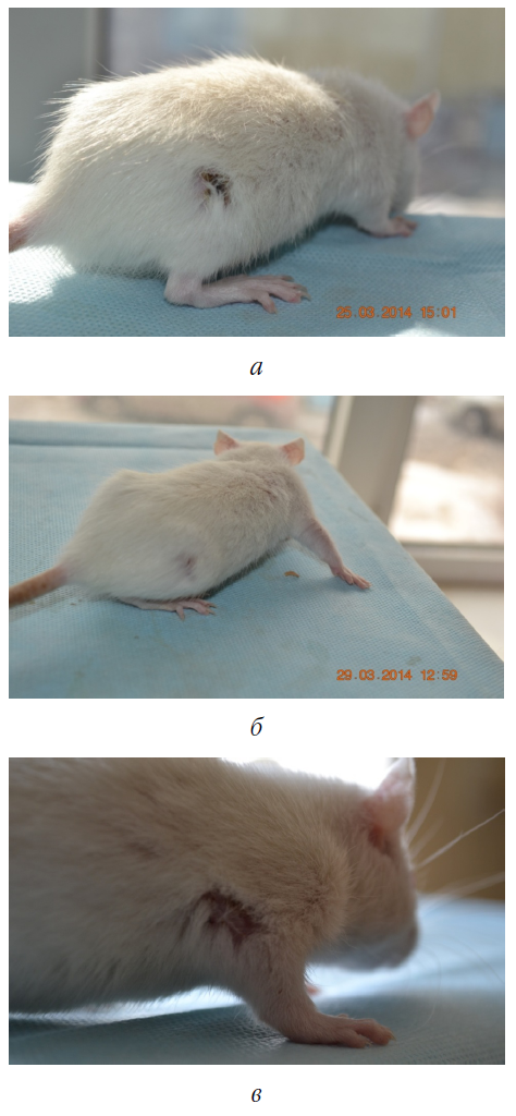 Рис. 4. Отдельный случай динамики отторжения трансплантируемой подкожно саркомы М-1: a – 35-е сутки после прививки; б – 39-е сутки после прививки; в – 81-е сутки после трансплантации саркомы М-1