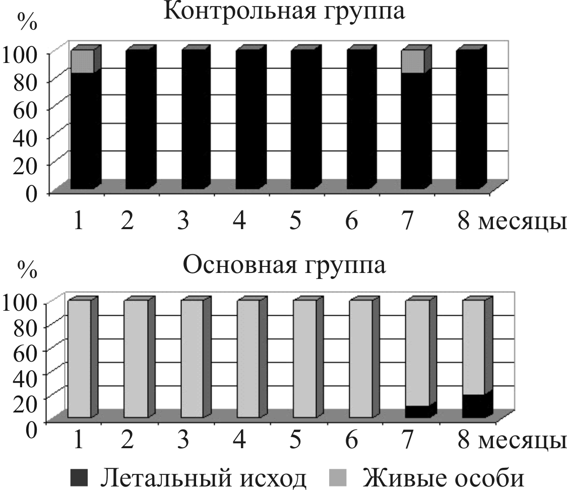 Частота летальных исходов в группах животных за период наблюдения была достоверно выше в группе контроля по сравнению с таковой в группе (c2 = 103,8; р < 0,0005).