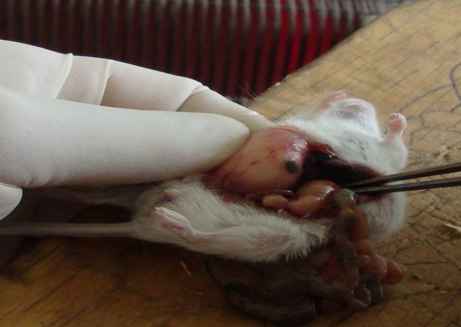 Через 7 месяцев в основной группе выявлен рост В-16 у одной беременной мыши из 10, после родов мышь умерла. Через 8 месяцев в основной группе выявлен рост В-16 у 4 из 10 мышей. Из них 2 беременные самки и 2 самца. У самцов образование регрессировало. Самки погибли через месяц.