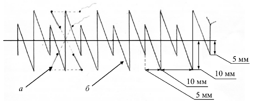 Рис. 1. Схема способа ушивания апоневроза после лапаротомии: а – укрепляющий шов; б – непрерывный шахматный шов