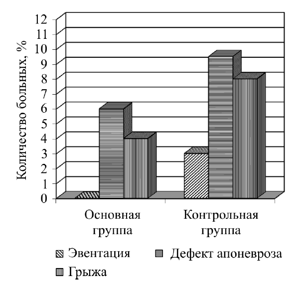 Результаты. В раннем послеоперационном периоде в контрольной группе было 2 (3 %) эвентрации, в основной группе эвентраций не было. Через 1 год наблюдения в основной группе выявлено 3 (6 %) пациента с дефектами апоневроза, обнаруженными при ультразвуковом исследовании послеоперационного рубца, и 2 (4 %) с грыжами. В контрольной группе через 1 год после операции наблюдалось 6 (9,5 %) апоневрозов и 5 (8 %) послеоперационных грыж.