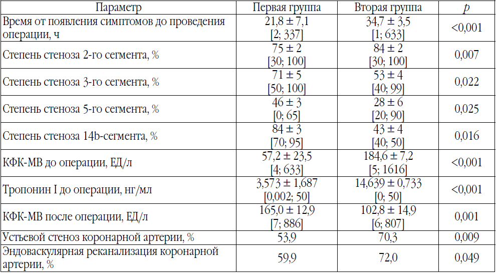 Степень стеноза 2-го сегмента, % | 75 ± 2 [30; 100] | 84 ± 2 [30; 100] | 0,007 |