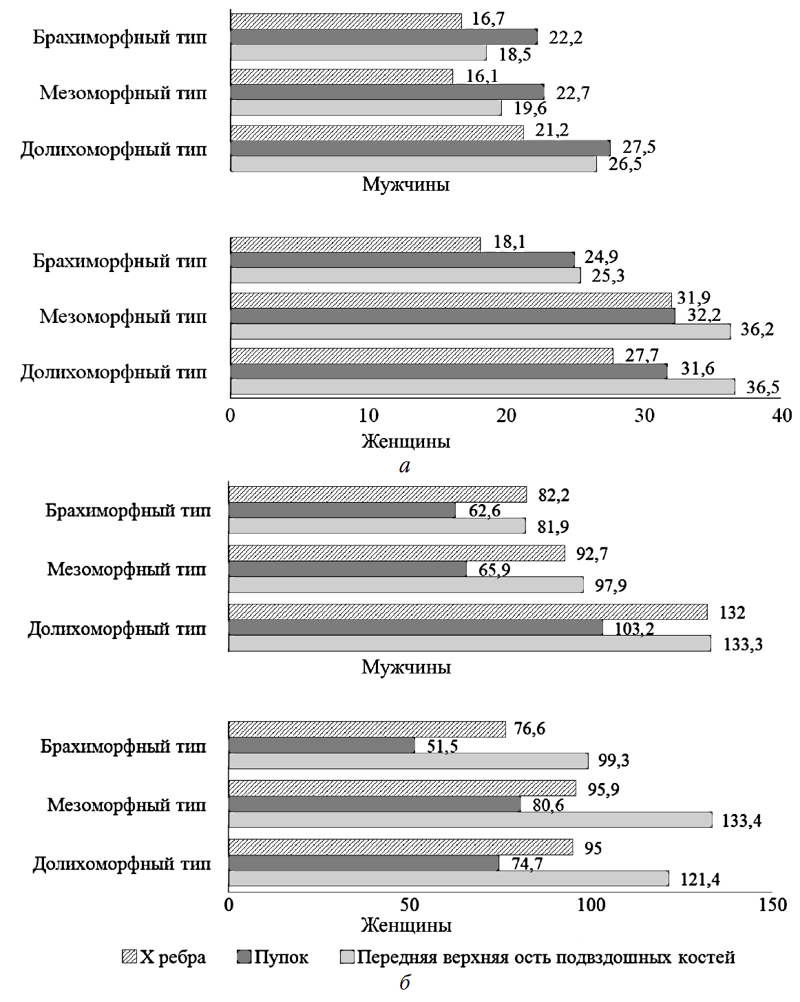 Анализ полученных данных позволяет сделать вывод, что и у мужчин, и у женщин при всех типах телосложения наименьшее значение глубина брюшной полости имеет на уровне пупка. Наглядно соотношение глубины брюшной полости на разных уровнях исследования у мужчин и женщин представлено на рисунке, б. Анализируя представленные в диаграмме данные, легко обнаружить отчетливые гендерные различия – у мужчин глубина брюшной полости на уровне нижних точек X ребер и на уровне передних верхних остей подвздошных костей имеет практически равные значения, тогда как у женщин глубина брюшной полости на уровне передних верхних остей подвздошных костей отчетливо превышает глубину брюшной полости на уровне X ребер.