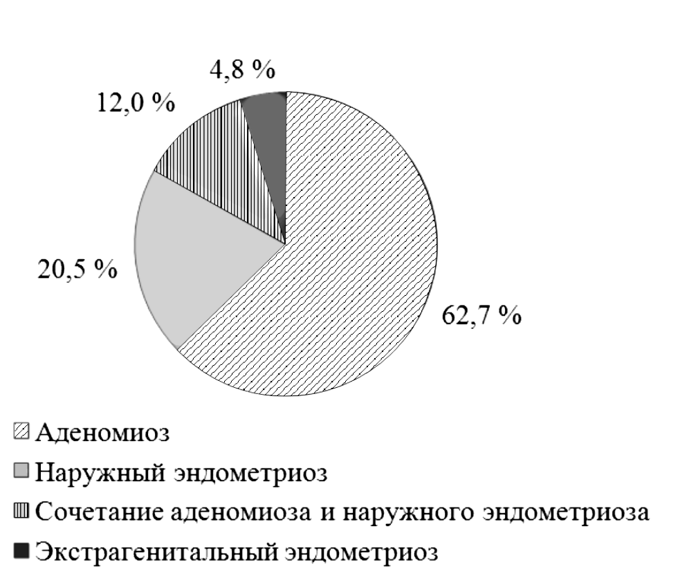 Диффузный аденомиоз встречался в 1,6 раза чаще, чем узловые формы (n = 32 и n = 20 соответственно); эндометриоидные кисты яичников (одно- и двусторонние) изолированно встречались в 20,5 % случаев (n = 17); сочетанная патология в виде внутреннего эндометриоза с кистами яичников – в 12,0 % случаев (n = 10). Различной локализации экстрагенитальный эндометриоз выявлен в 4,8 % случаев (n = 4), но можно предположить, что его распространенность еще выше, так как метод магнитно-резонансной томографии не позволяет идентифицировать мелкие эндометриоидные гетеротопии на брюшине малого таза. Структура различных форм эндометриоза представлена на рис. 1.