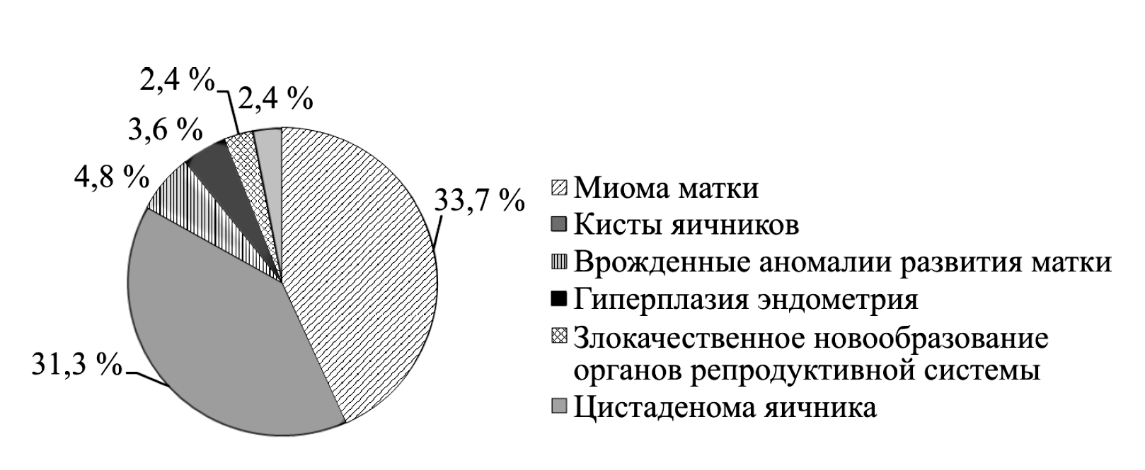 В группе больных эндометриозом при магнитно-резонансной томографии выявлена сопутствующая гинекологическая патология: миома матки – 33,7 % (n = 28), функциональные кисты яичников – 31,3 % (n = 26), врожденные аномалии развития матки – 4,8 % (n = 4), гиперпластические процессы эндометрия – 3,6 % (n = 3), цистаденома яичника – 2,4 % (n = 2) (рис. 2). Кроме этого, обнаружены ранее не диагностированные рак шейки матки – 1,2 % (n = 1) и злокачественное новообразование яичника – 1,2 % (n = 1), подтвержденные в дальнейшем результатами гистологического исследования.
