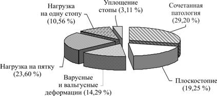 Анализ структуры выявленных морфофункциональных нарушений стоп у детей (рисунок) показал, что первое место (29,2 %) в структуре принадлежит сочетанной патологии, в состав которой во всех случаях входит плоскостопие, на долю которого вместе с изолированным (составляющим 19,25 %) приходится 48,45 %, далее следуют увеличение нагрузки на пятку, варусная и вальгусная деформации стоп, увеличение нагрузки на одну из стоп и уплощение стопы.