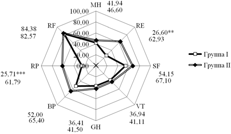 Рис. Качество жизни женщин с функциональными кистами яичников, баллы: степень достоверности разности сравниваемых показателей между группами I и II:** − p < 0,01; *** – p < 0,001