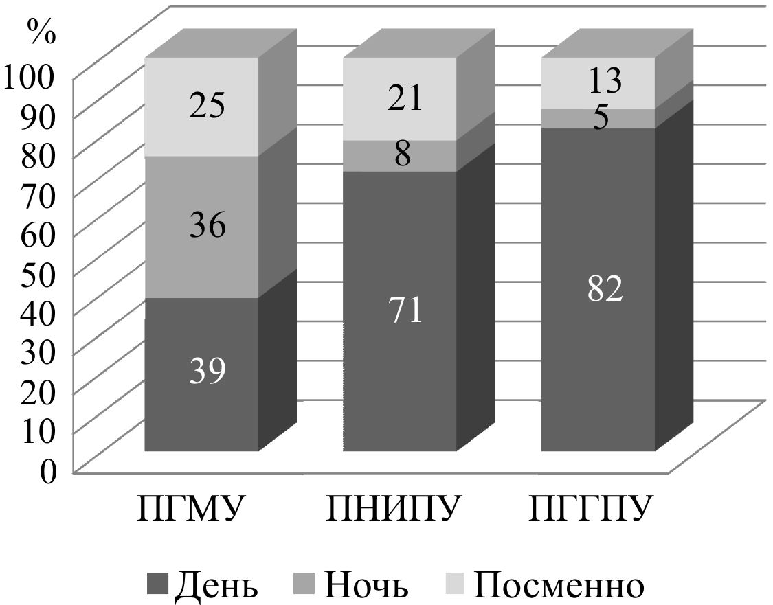 Перечисленные выше особенности оказывают влияние на социальную активность. Среди студентов трех вузов г. Перми наибольший процент работающих (39 %) составляют студенты ПГГПУ (рис. 1). Однако 82 % из них предпочтение отдают дневным сменам и лишь 5 % работают в ночное время. 13 % учащихся имеют сменный график работы. Аналогичная ситуация имеет место у студентов ПНИПУ. Работающие составили 24 % от общего количества респондентов. В дневное время работают 71 % учащихся, в ночное время – 8 %, совмещают дневные и ночные смены – 21 % респондентов. Среди студентов медицинского университета работающие составляют 36 %. У этих студентов выявлялся наиболее высокий риск по нарушению циркадианных ритмов: 36 % имеют ночные смены, 25 % работают посменно, что составляет 61 % от общего числа работающих студентов. Лишь 39 % из них работают днем.