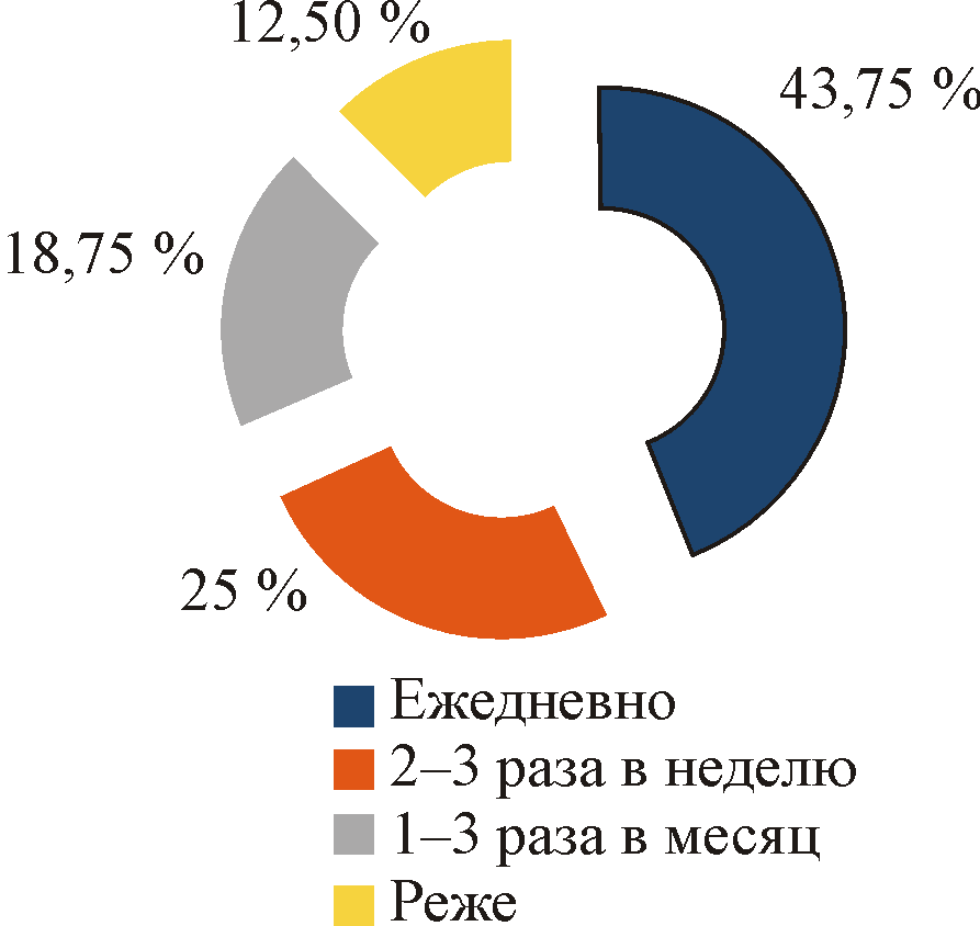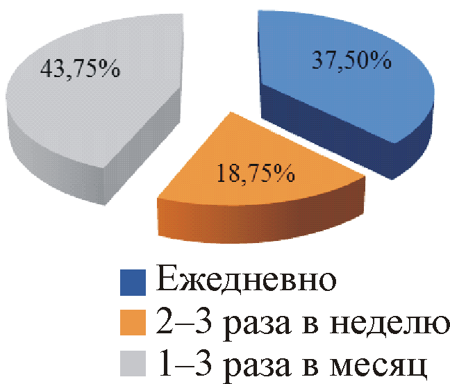 37,5 % больных АГ изучаемой группы зафиксировали ежедневные эпизоды повышенного уровня АД (41,7 % среди женщин и 25 % среди мужчин). Еще 18,75 % больных АГ указали на периодически отмечавшиеся подъемы АД с частотой до 2–3 раз в неделю. Остальные 43,75 % больных АГ (33,3 % среди женщин и 75 % среди мужчин) указали на менее частые случаи повышения уровня АД – от 1 до 3 раз в месяц (рис. 1).