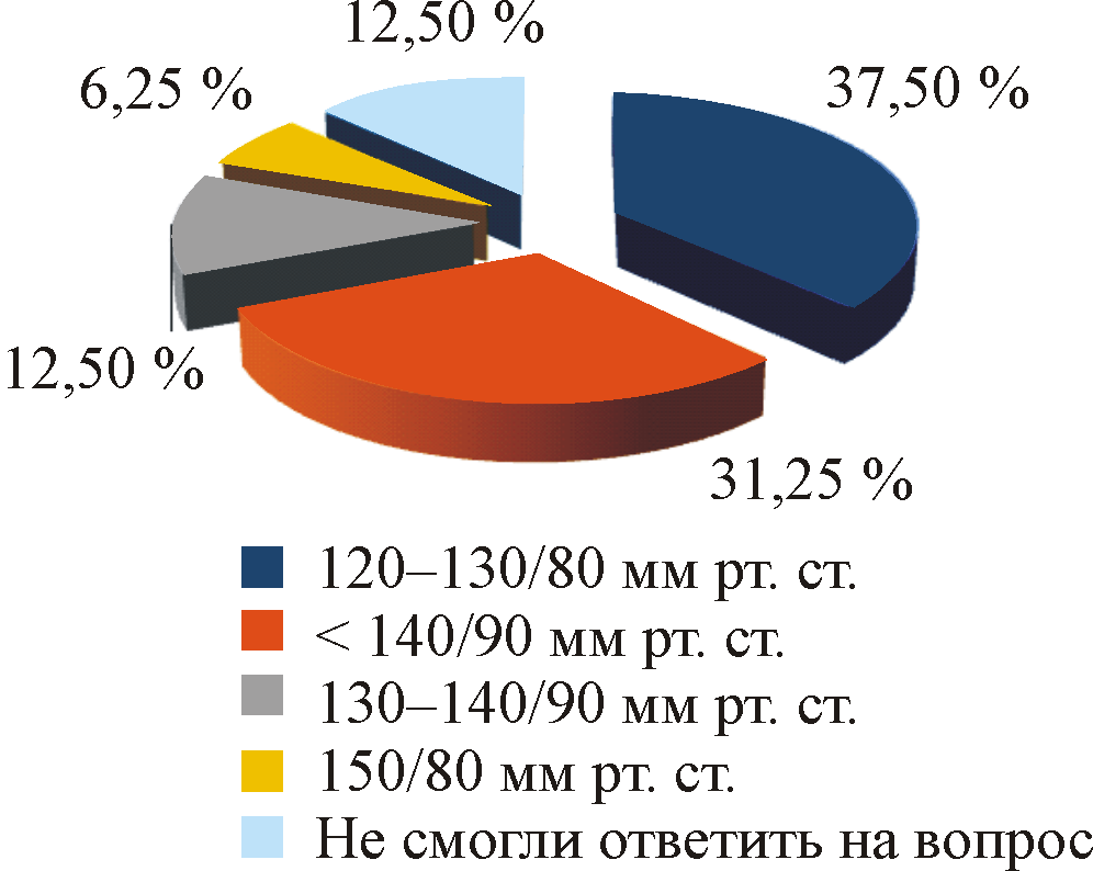 Интересно, что на вопрос о том, какой уровень АД больные АГ считают для себя «оптимальным», т.е. позволяющим чувствовать себя удовлетворительно, только 37,5 % опрошенных с уверенностью отметили уровень АД 120–130/80 мм рт. ст. (рис. 3). 12,5 % опрошенных указали уровень АД 130–140/90 мм рт. ст. В этой же группе оказалась больная АГ, которая в качестве «оптимального» для себя АД отметила уровень 150/90 мм рт. ст. Еще 31,25 % больных АГ отметили уровень АД 140/90 мм рт. ст. и ниже.