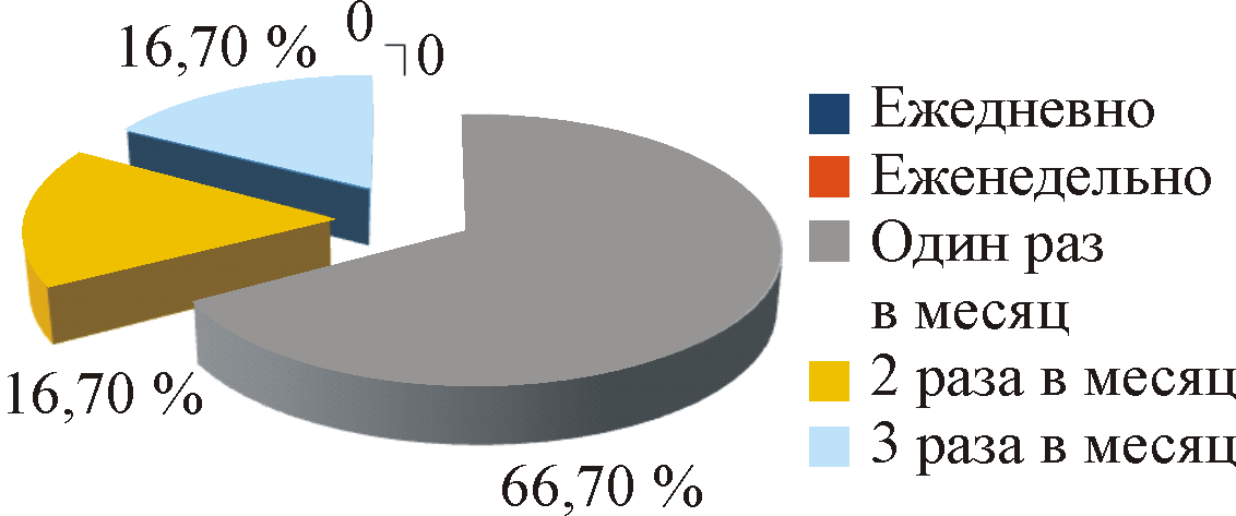 Как показано на рис. 5, практически все опрошенные рассматриваемой группы указали на редкие случаи повышения уровня своего АД в течение исследуемого периода времени – не чаще, чем один (66,7 %), 2 (16,7 %), 3 (16,7 %) раза в месяц.