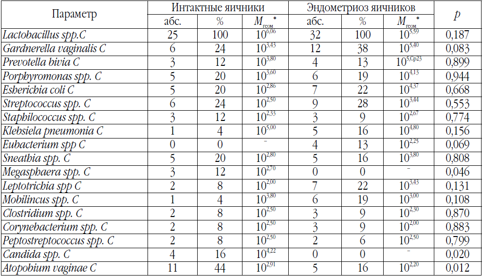 Микробный пейзаж цервикальной порции у пациенток с интактными яичниками и эндометриозом яичников