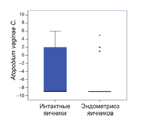 Рис. 1. Среднее геометрическое количество Аtopobiumvaginae в цервикальной локализации у пациенток с интактными яичниками и эндометриозом яичников
