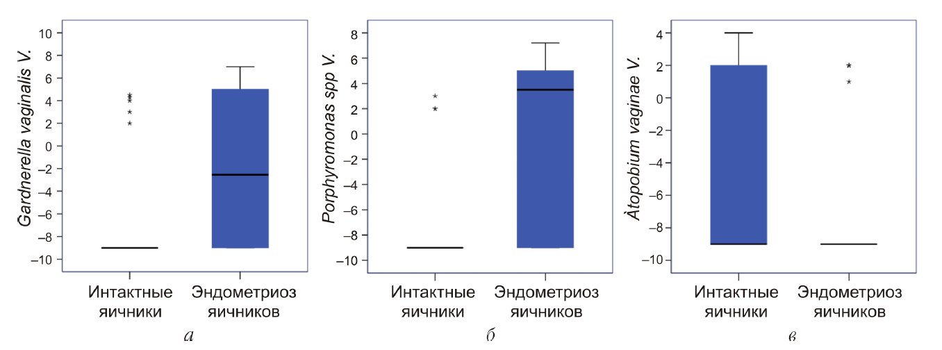 Рис. 2. Среднее геометрическое количество во влагалищной локализации у пациенток с интактными яичниками и эндометриозом яичников: а – Gardnerella vaginalis; б – Porphyromonas spp.; в – Аtopobium vaginae