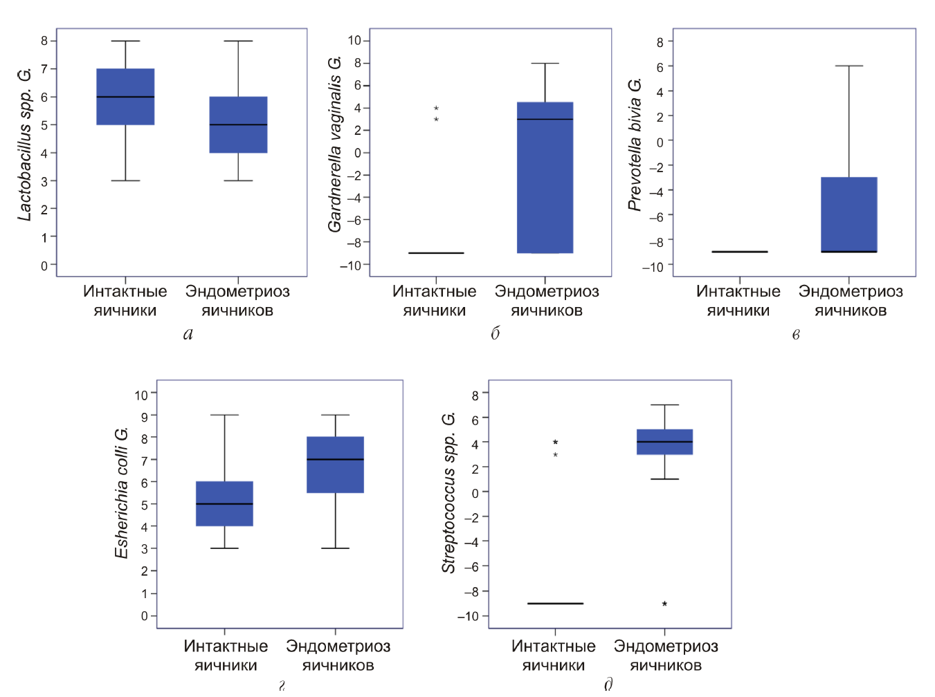 Рис. 3. Среднее геометрическое количество в кишечнике у пациенток с интактными яичниками и эндометриозом яичников: а – Lactobacillus spp.; б – Gardnerella vaginalis; в – Prevotella bivia; г – Esherichia colli; д – Streptococcus spp.